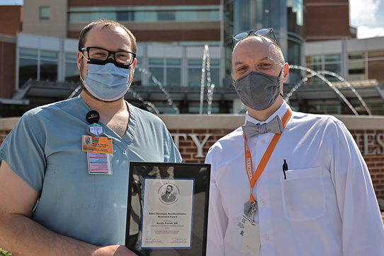 Dr. Dustin Powell accepts the RSNA Roentgen Resident Research Award. Also pictured, Program Director, Dr. Ian Gray.